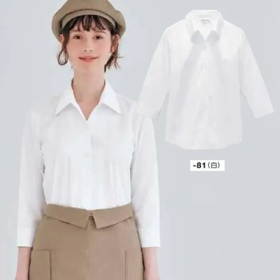 きちんと感と抜け感を両立するレディーススキッパーシャツ七分袖。Primeflex®使用ストレッチブロードでポリエステル75%・綿25%。袖口スリットで手元がすっきり見えて動きやすく接客や受付のユニフォームに好印象です。