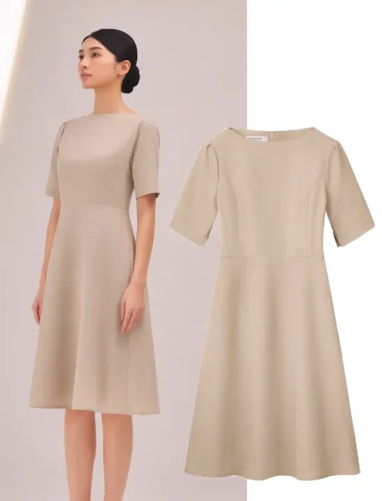 ・デコルテの美しさにこだわったサブリナネックデザイン・肩にさりげないタックを施し控えめな華やかさと立体感を演出・ウエストラインは自然にシェイプし裾に向かって広がるフレアシルエット・バックスタイルはセンターファスナーとソフトタック仕様で着脱しやすく動きやすい設計・ひざ下丈で立ち居振る舞いにも安心感のあるデザイン・シンプルな中に上品な美しさを感じさせる仕上がり