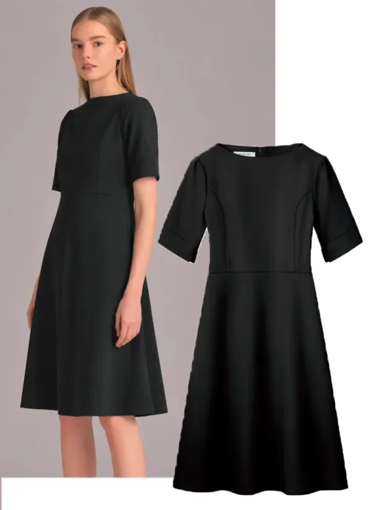・デコルテの美しさにこだわったサブリナネックデザイン・肩にさりげないタックを施し控えめな華やかさと立体感を演出・ウエストラインは自然にシェイプし裾に向かって広がるフレアシルエット・バックスタイルはセンターファスナーとソフトタック仕様で着脱しやすく動きやすい設計・ひざ下丈で立ち居振る舞いにも安心感のあるデザイン・シンプルな中に上品な美しさを感じさせる仕上がり