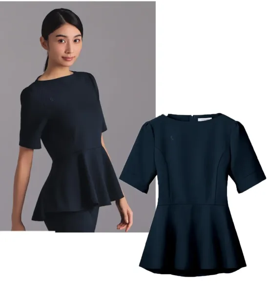 ESTNATION×FOLKのコラボレーションシリーズ。ウエストの切り替えから広がるペプラムシルエットで、洗練された美しさと体型カバーを両立。ポリエステル100%のESリュクスモーション素材を使用し、軽やかな着心地と上品な佇まいでおもてなしの所作を優雅に演出します。