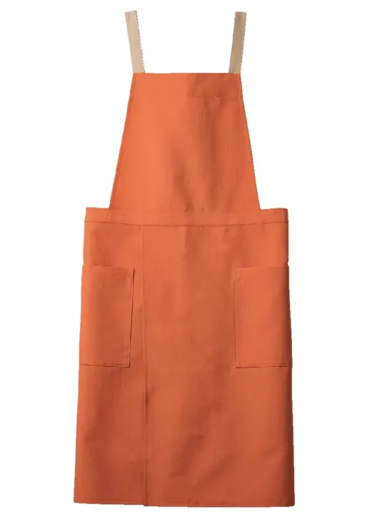・肩紐がずれにくく負担を分散するH型デザイン・ヒップまでしっかりカバーする安心感のある丈感・ウエストはドットボタン仕様で簡単にサイズ調整が可能・ペン差し付きポケットを備え実務に対応・自然由来の色味が空間になじみ落ち着いた印象を演出