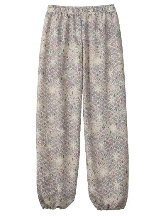 和装の美しさを仕事服として昇華させた茶衣着パンツです。落ち着きのあるグレーを基調に、吉祥七宝文様をあしらった上品で洗練されたデザインが特長。海外で「KIMONO」として注目される和風スタイルを、現代の職場にふさわしい機能性とともに表現し、おもてなしの心を静かに印象づけます。