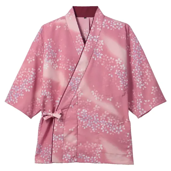 和装の美しさをそのままに仕事服としての機能性を高めたレディース茶衣着上衣です。春霞を思わせる淡いピンクをベースに、舞い散る桜花をあしらった華やかなデザインが特長。海外で「KIMONO」として注目される和風スタイルを、現代の職場にふさわしい機能性とともに表現し、おもてなしの心を自然に演出します。