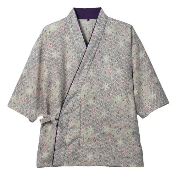 和装の美しさをそのままに仕事服としての機能性を高めたレディース茶衣着上衣です。落ち着きのあるグレーを基調に、吉祥七宝文様をあしらった上品で洗練されたデザインが特長。海外で「KIMONO」として注目される和風スタイルを、現代の職場にふさわしい機能性とともに表現し、おもてなしの心を自然に演出します。