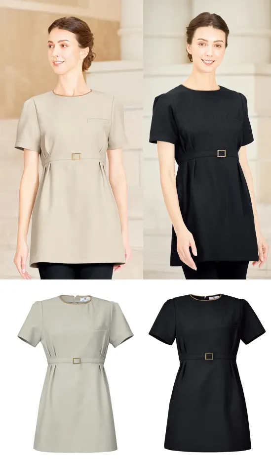 ・パイピングやバックルのゴールドを効かせたエレガントなデザインが上品な印象・ヒップラインを自然にカバーするチュニック丈設計・動作を妨げにくいシンプルな半袖仕様・きちんと感のある表情で接客シーンに最適・パンツと合わせやすくコーディネートしやすいデザイン・イージーケア性に優れ、ピリングもしにくい高感度で機能性の高いウールライクファブリック。・一部にペットボトルをアップサイクルしたポリエステル原料を使用した、環境と人の未来を考えたサスティナブルな素材。・しっかりした中肉厚でざっくりとしたナチュラルウールのような風合いが特徴