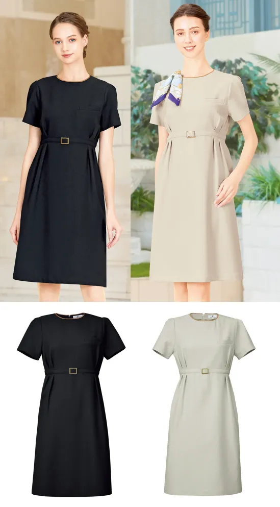 上品な佇まいと着心地の良さを兼ね備えたレディースワンピースです。襟もとのパイピングとウエストのゴールドのバックルが華やか度をUPさせています。上質でツイーディーな風合いの素材を使用しているため、好印象なイメージです。シンプルながら洗練されたシルエットで、受付・インフォメーション・接客シーンなど幅広い業務に対応します。
