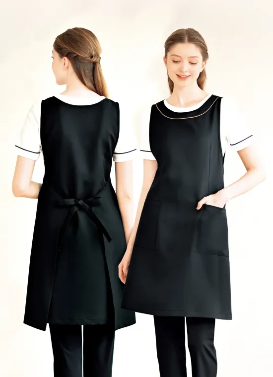 落ち着いた印象と動きやすさを両立したエプロンドレスです。チュニック感覚で着用できるデザインにより、接客業やサービス業のユニフォームとして幅広く対応。すっぽりかぶって前後で結ぶだけで、おしりが隠れるエプロンドレスが簡単に完成。襟ぐりにパイピングをあしらっているので、おしゃれ感もあり働く現場にぴったりです。しわになりにくいのでアイロンなしでもOKです。